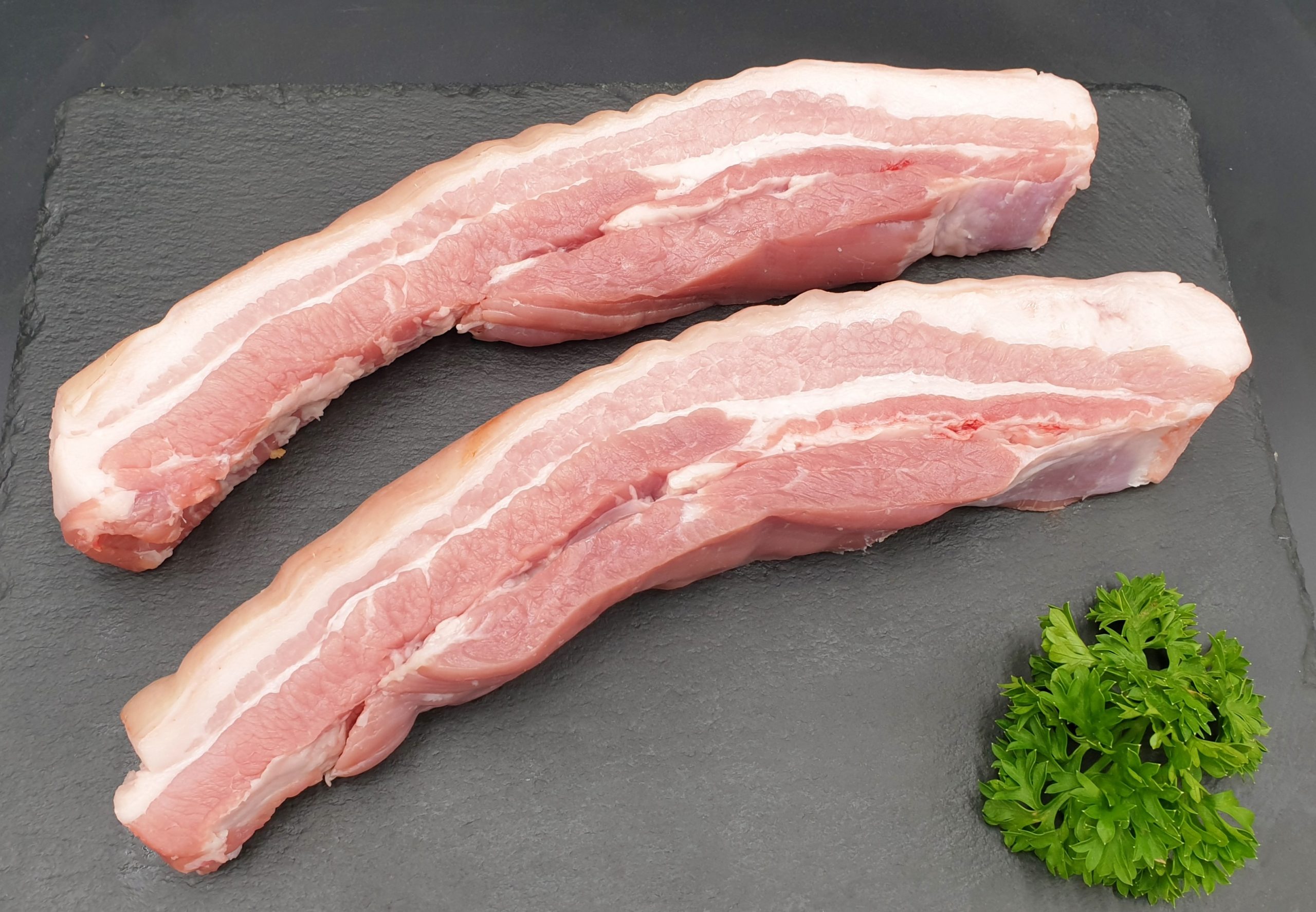 Pork belly sliced into uniform strips for fast cooking and portion control.